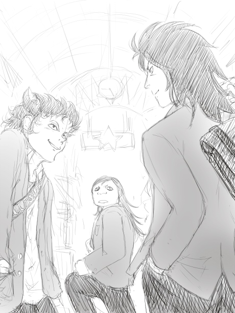 ゆっくり歩くシリウスと、喋りまくりながらちんたら歩くディオと、早くしないとコロッケ売り切れちゃうだろなアルゲティ。なんかいいよね青春男子って感じで。